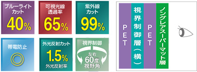 ブルーライトカット40%。豊富なサイズラインナップ(ノート、デスクトップ)でオーダーメイドも可能な覗き見防止フィルター。